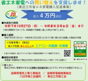 「東近江市省エネ家電促進事業」を利用してエアコンを・・・とお問い合わせをいただきました。