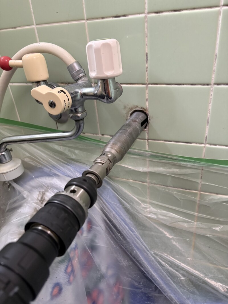 まずは水栓の配管を新しく挿入するため開口します。